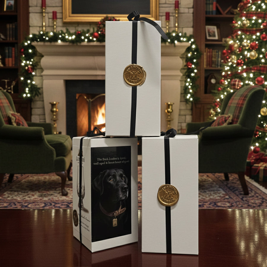 🎁 Beautiful gift box featuring a loyal black Labrador, hand poured gold wax seal and satin ribbon. Ready for gifting!